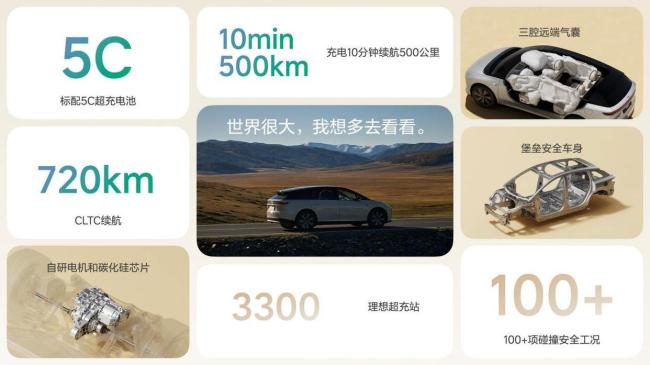理想i6全系标配87.3度全新5C磷酸铁锂电池,CLTC续航能力最高可达720公里,具备超级续航、超级充电、超级放电、超级耐久、超级安全五大亮点。搭载理想汽车自研的碳化硅电驱系统,电机综合效率达到行业领先的93.08%。理想i6最高充电功率可达500千瓦,两驱版本拥有“10分钟500公里”的充电速度,同时行业独有的“双呼吸”冷却系统能有效控制电池温度,保证电池使用寿命。理想汽车已上线根超充桩,覆盖全国最繁忙的高速公路核心路段,平均间隔150公里。理想城市超充站总数突破2200座,总覆盖城市数量达到267个,并在一二线分钟充电生活圈”。